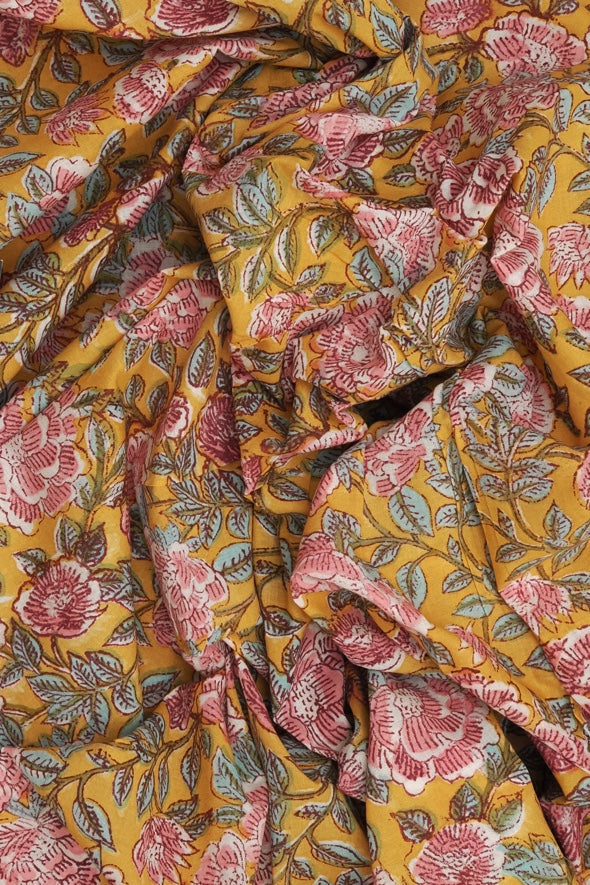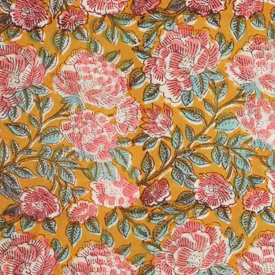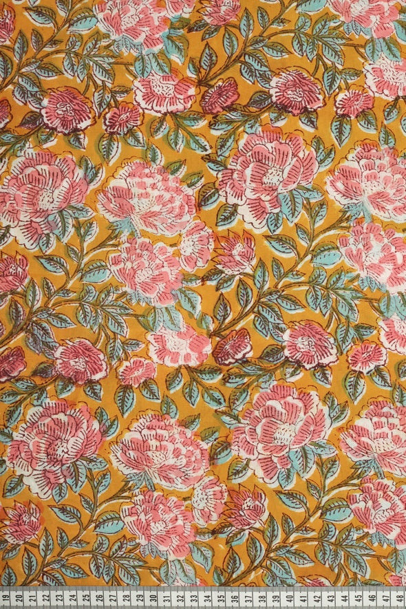 • Pink roses and green foliage on a golden yellow background.